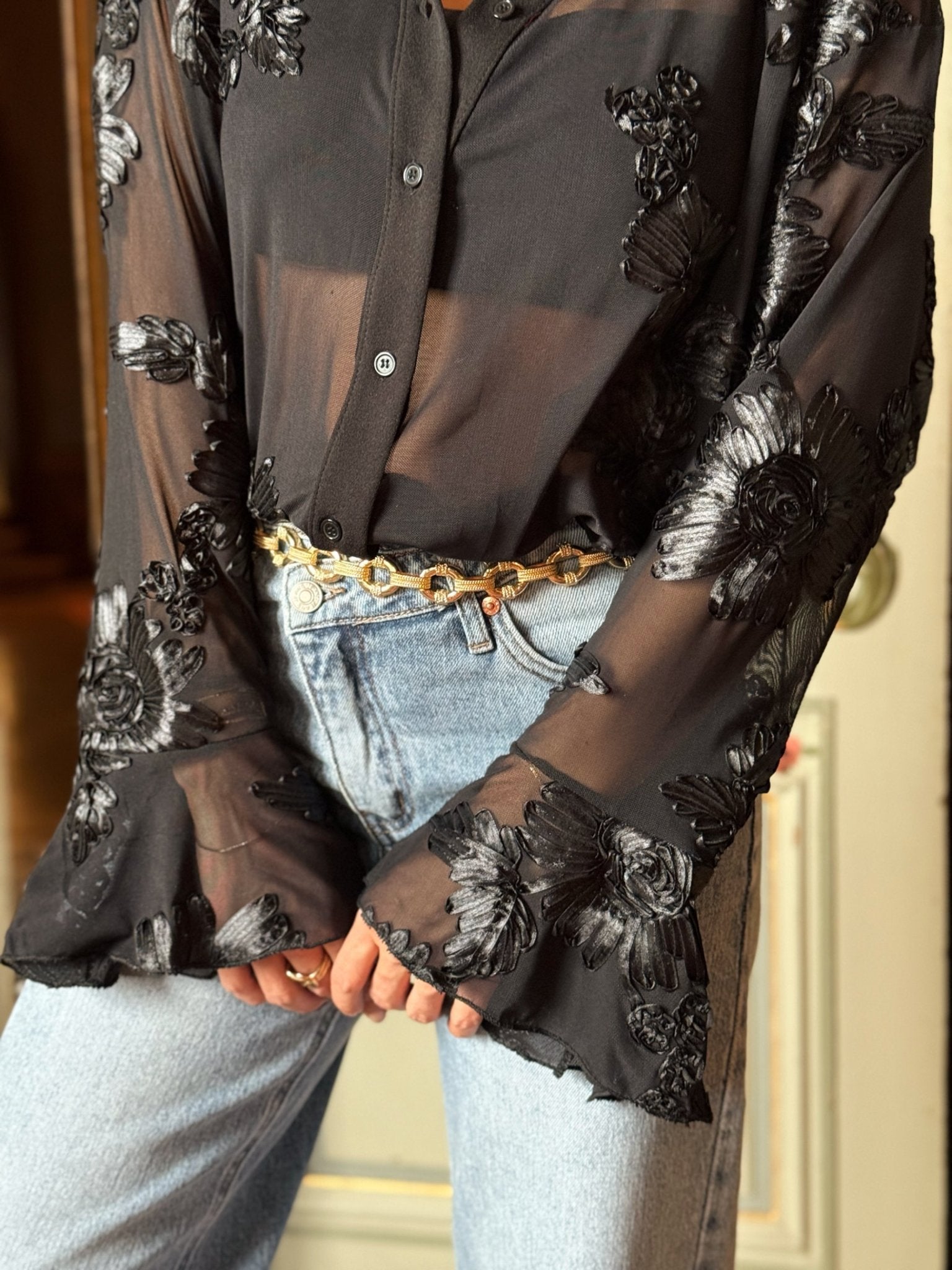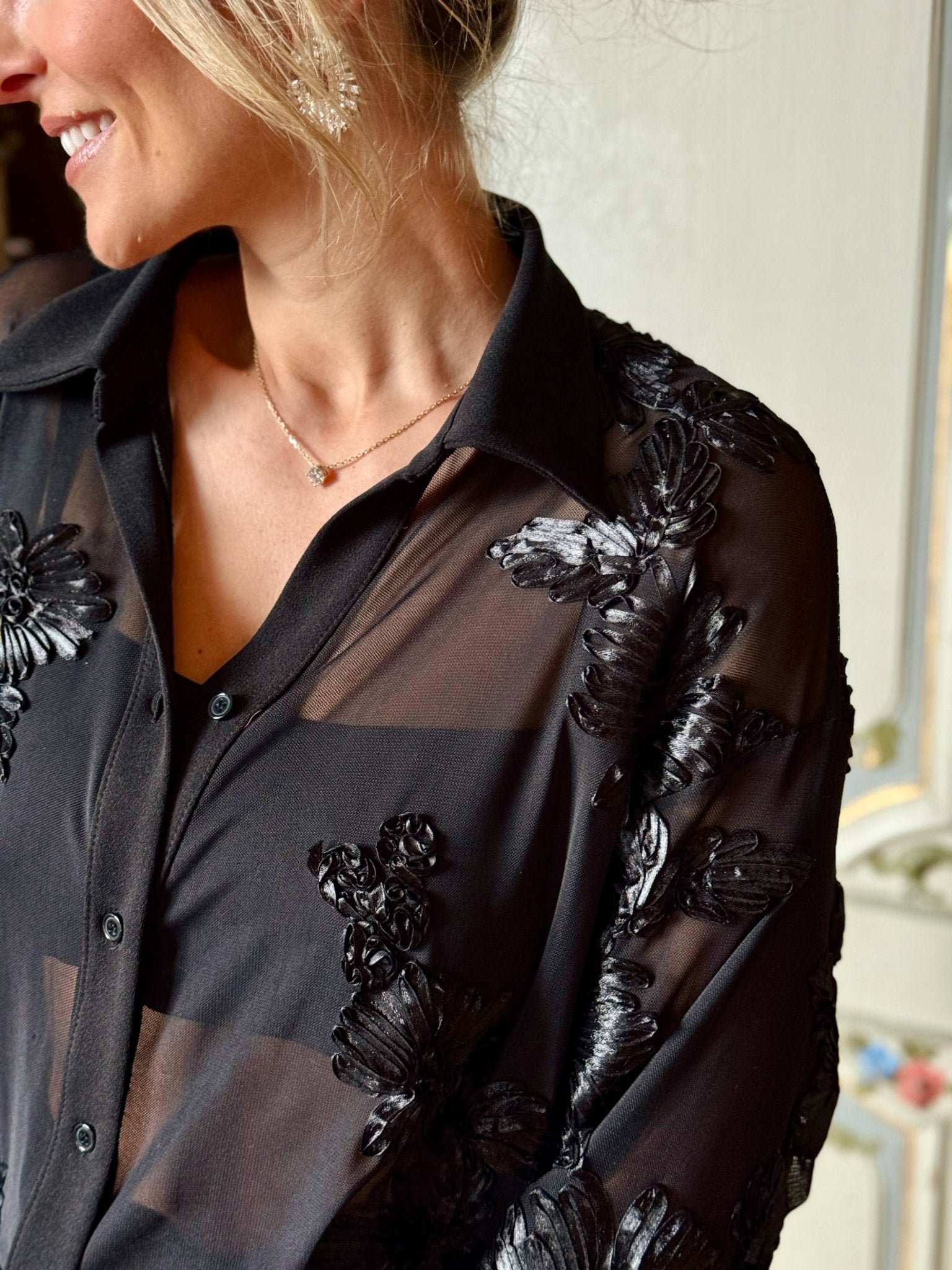 Un chemisier élégant et raffiné, pensé pour celles qui aiment les pièces qui attirent le regard tout en restant chic. Son voile transparent laisse deviner subtilement la silhouette, tandis que ses fleurs en relief brodées ton sur ton apportent une touche sophistiquée et ultra-féminine. Fluide et lumineux, il se porte aussi bien rentré dans un jean pour un look tendance que sur un pantalon habillé pour une allure soirée.