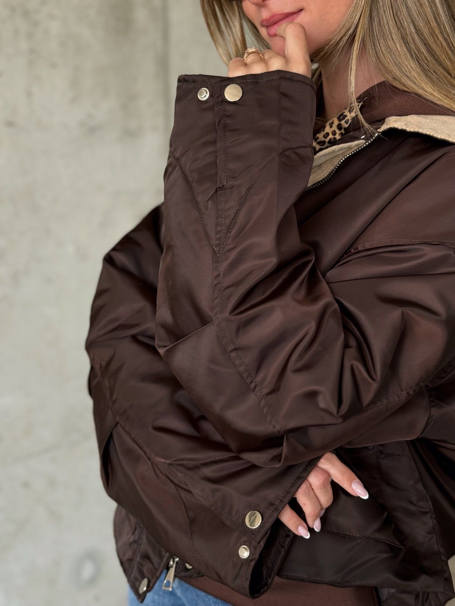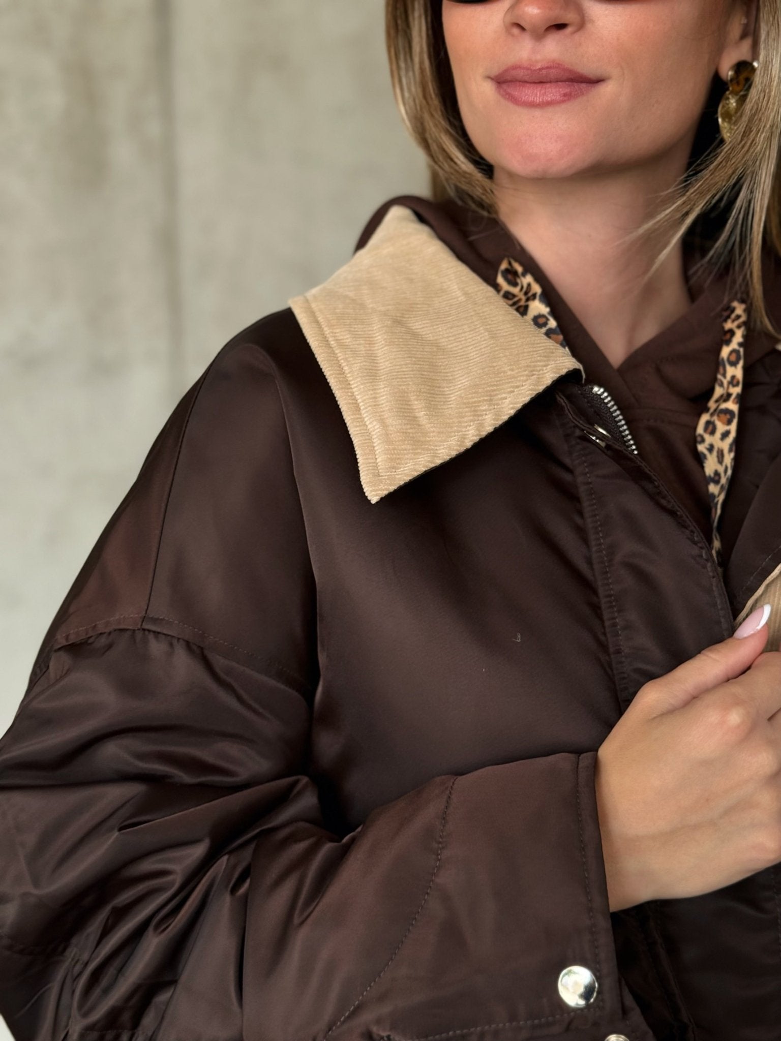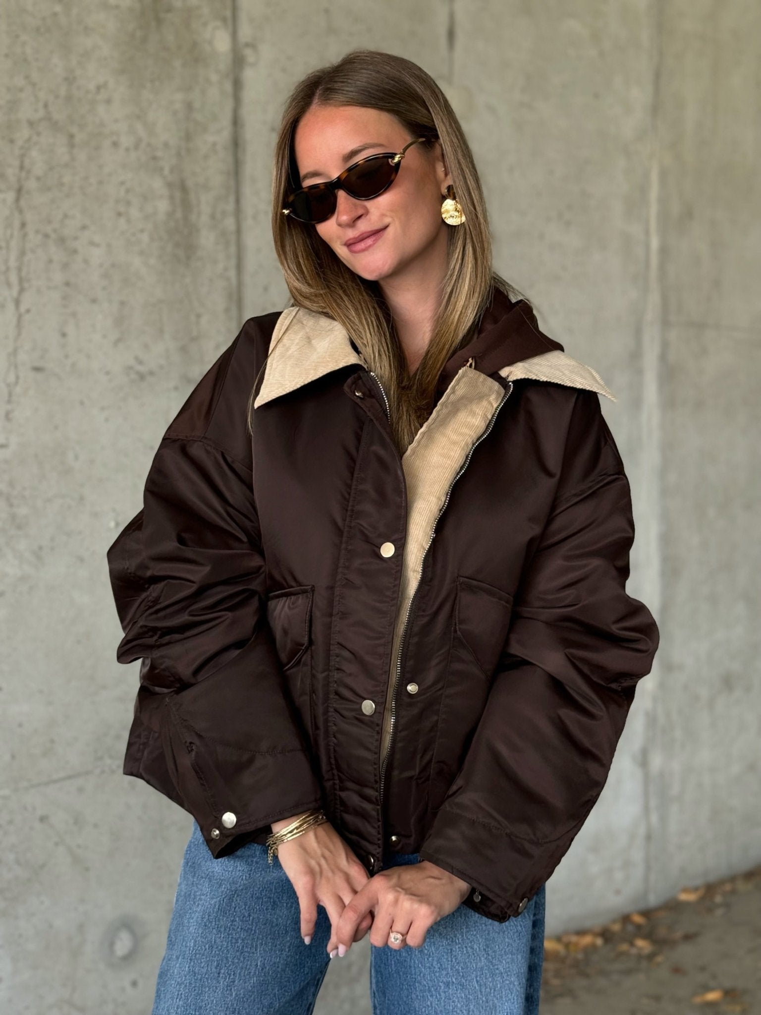 ✨ La veste Julia marron est une pièce pratique et tendance qui séduit par sa matière réversible. Son col et une partie de l’intérieur sont en velours beige, apportant une touche chic et douce à l’ensemble. Légèrement épaisse, elle est parfaite pour la mi-saison et combine confort et style. Avec sa coupe ample, ses poches pratiques et sa double fermeture tirette + pressions, elle devient un indispensable du dressing.