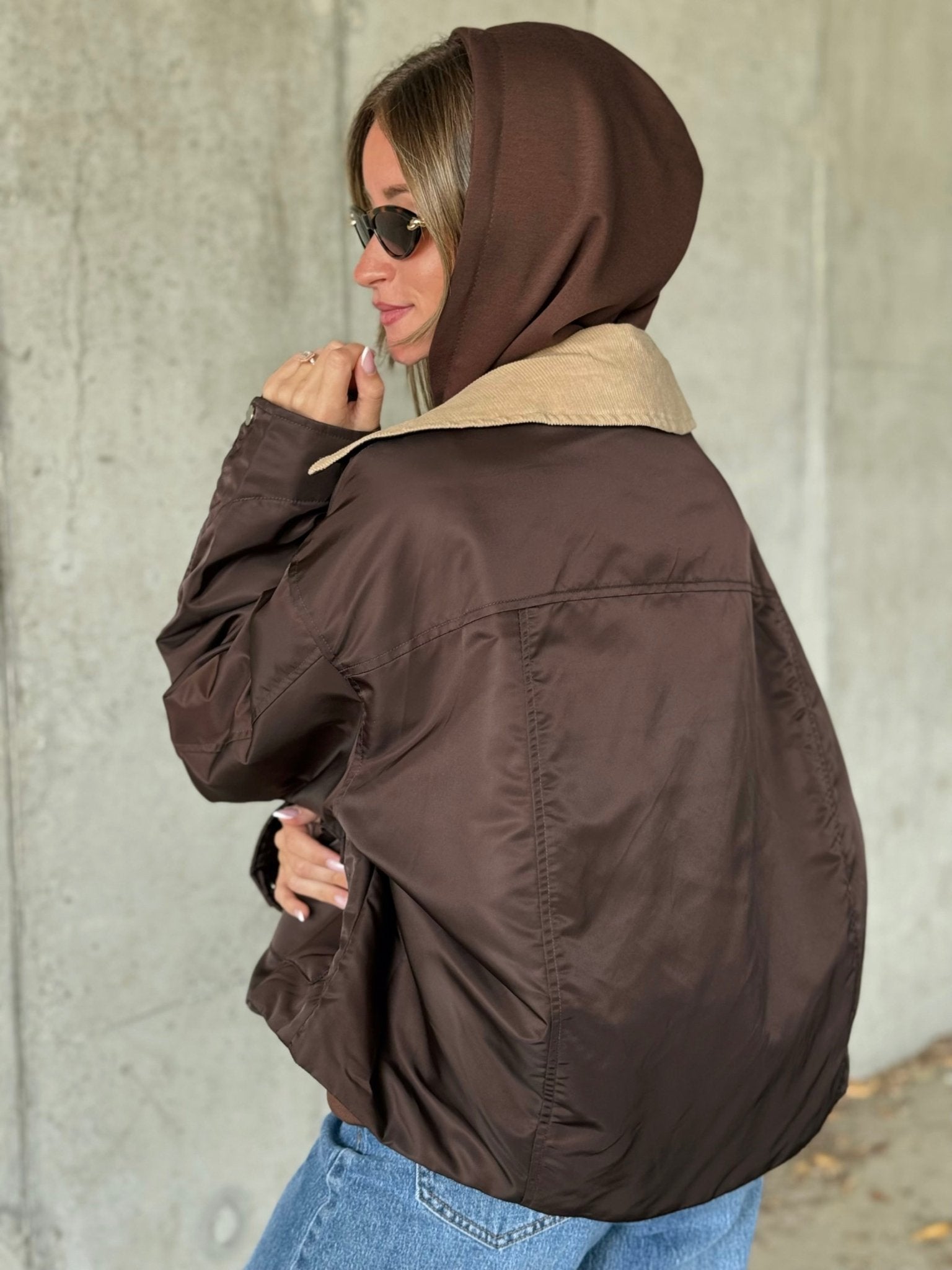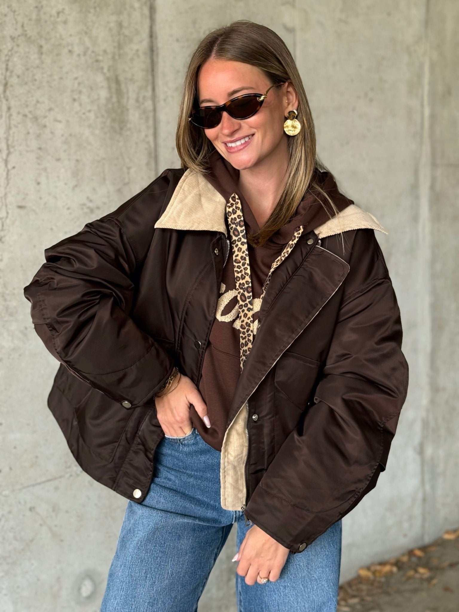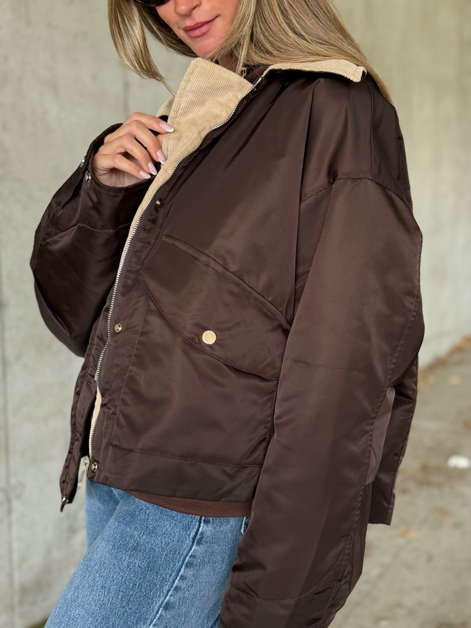 ✨ La veste Julia marron est une pièce pratique et tendance qui séduit par sa matière réversible. Son col et une partie de l’intérieur sont en velours beige, apportant une touche chic et douce à l’ensemble. Légèrement épaisse, elle est parfaite pour la mi-saison et combine confort et style. Avec sa coupe ample, ses poches pratiques et sa double fermeture tirette + pressions, elle devient un indispensable du dressing.