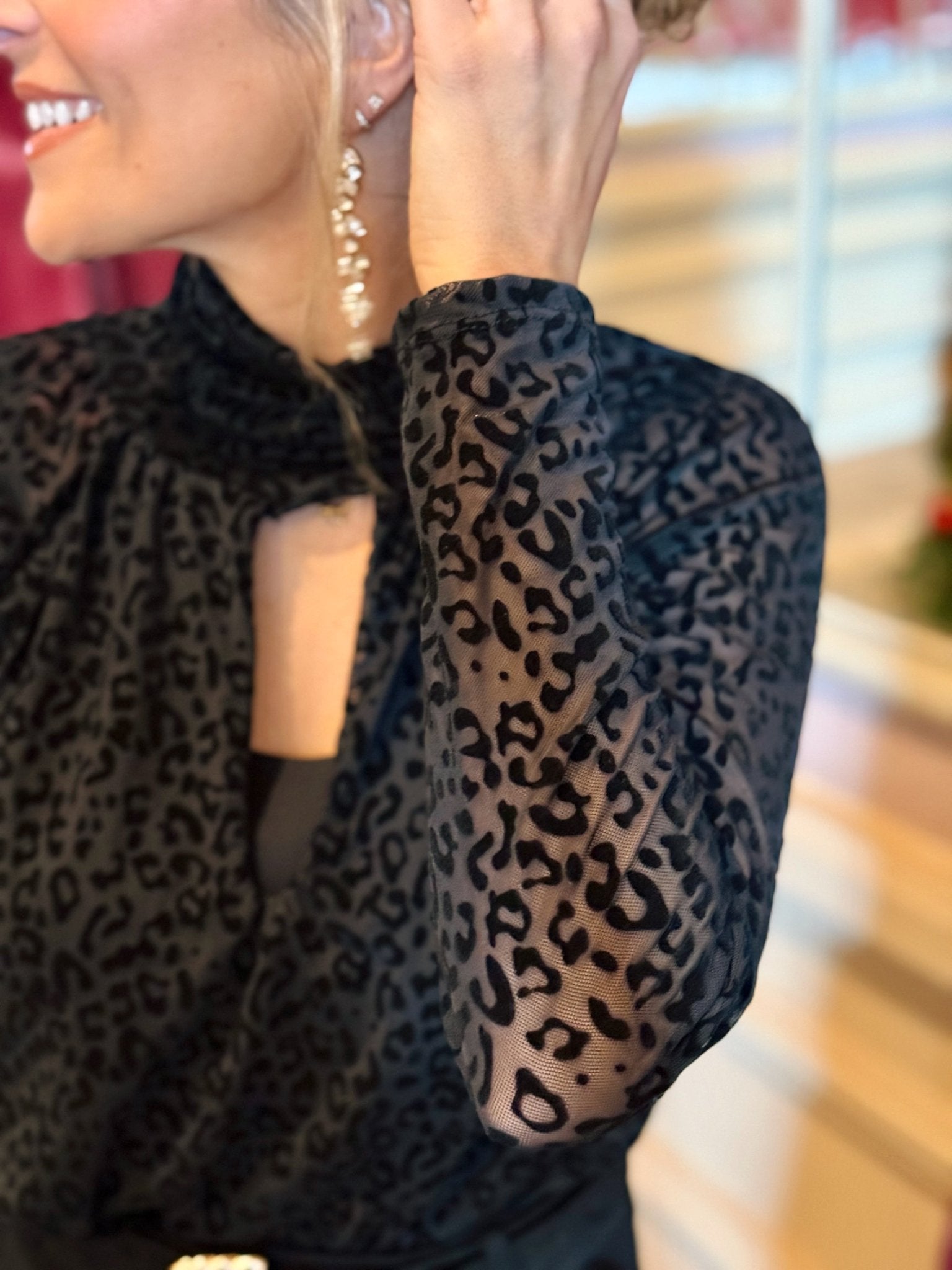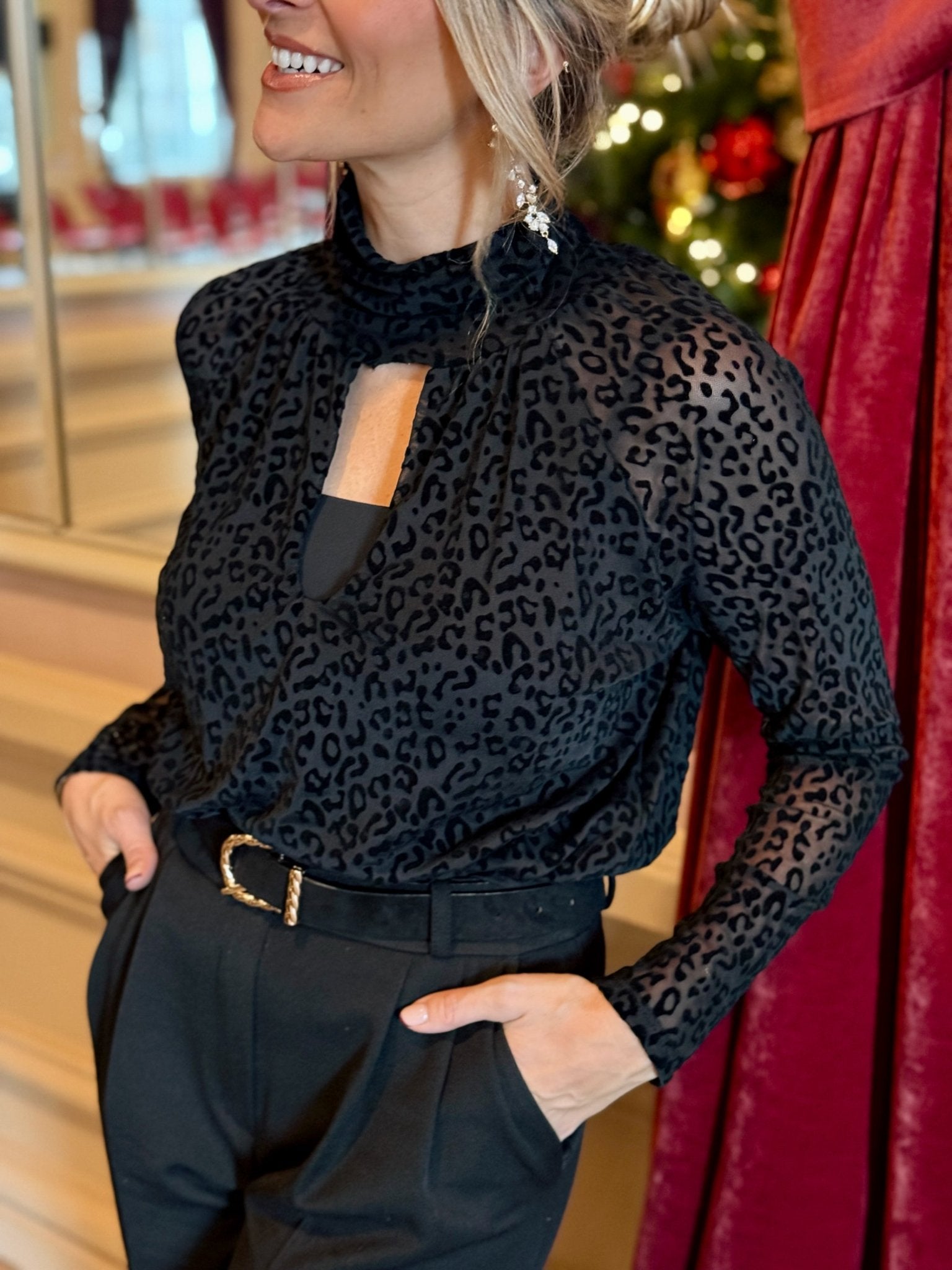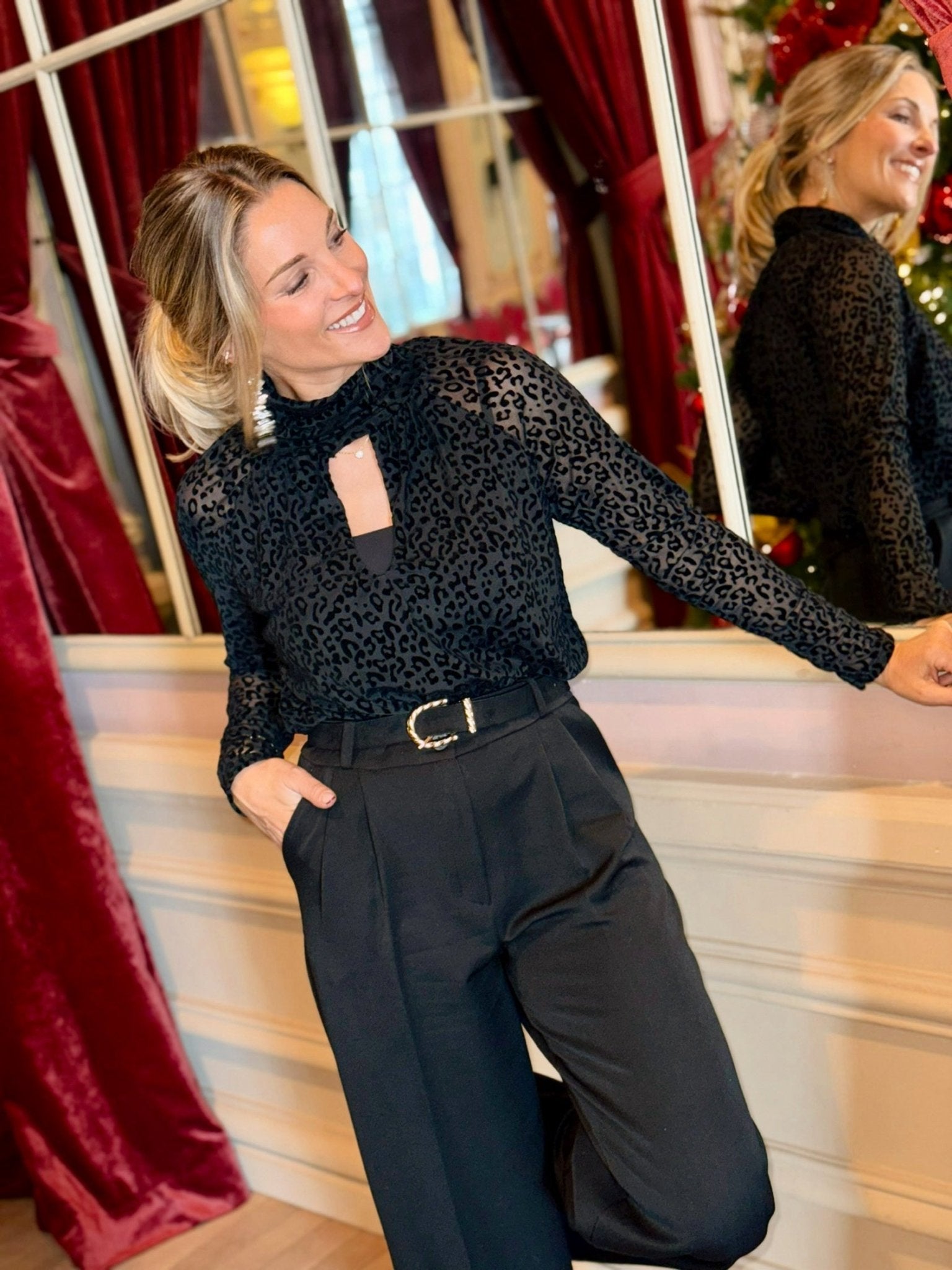 Un body chic et audacieux qui sublime la silhouette avec son jeu de transparence élégant. Le devant est doublé pour un porté confortable, tandis que le dos et les manches en voile dévoilent délicatement la peau. Son motif velours effet léopard apporte une touche glamour parfaite pour les soirées et les looks sophistiqués.
