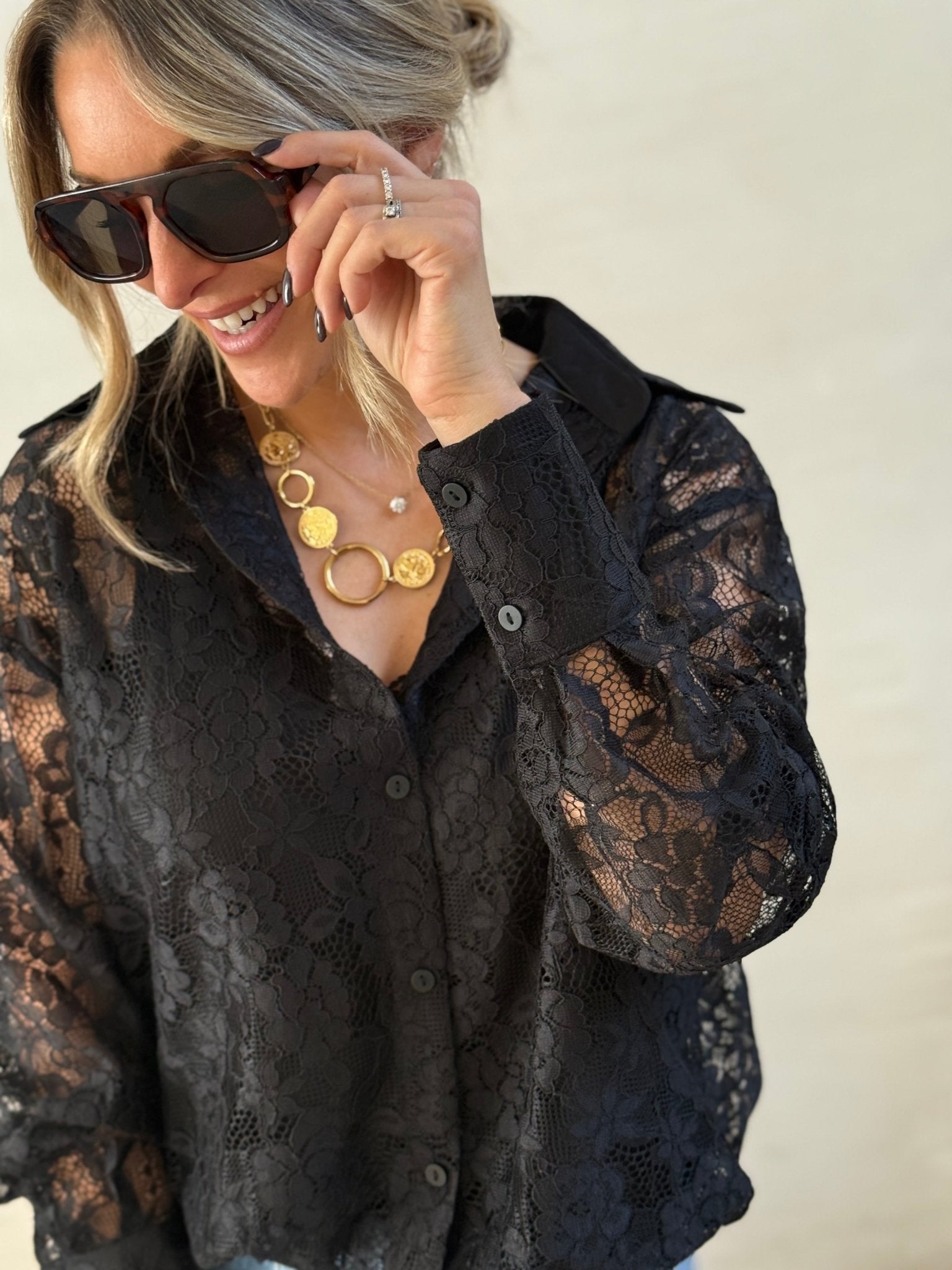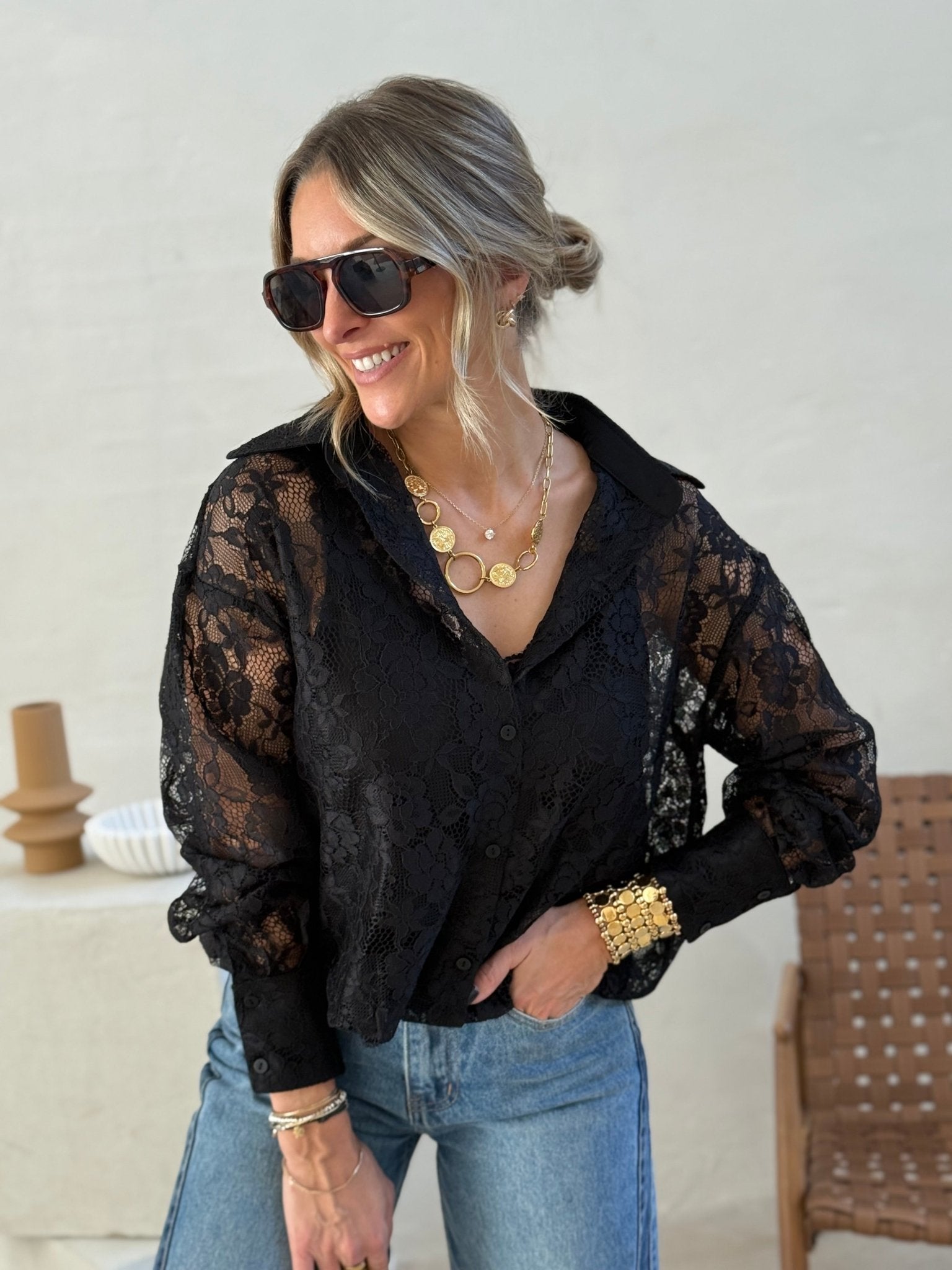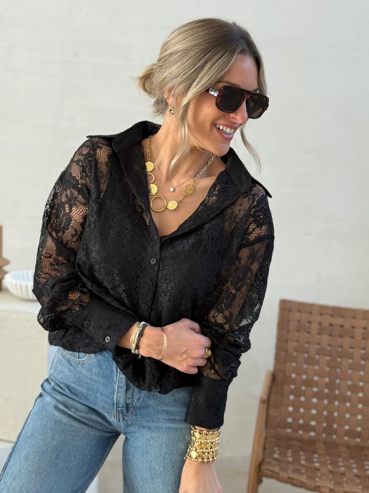 La chemise Margaux séduit par sa délicate dentelle florale noire et sa coupe fluide. Elle se distingue par sa doublure en top intégré, fixée à la chemise pour un maintien parfait et un rendu élégant sans transparence excessive. Une pièce féminine et raffinée, idéale pour une soirée ou un look chic du quotidien.