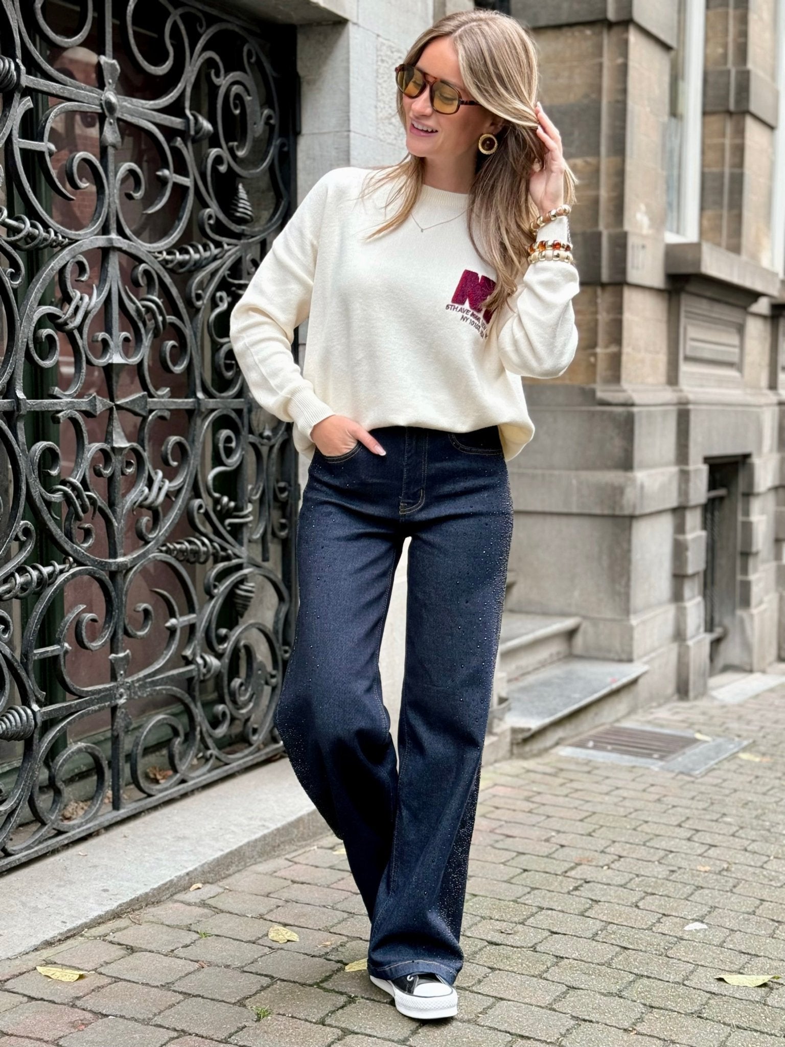 Un jean confortable et féminin avec juste ce qu’il faut d’éclat. Les strass apportent une touche chic et festive, idéale pour sublimer une tenue simple ou pour une soirée élégante.