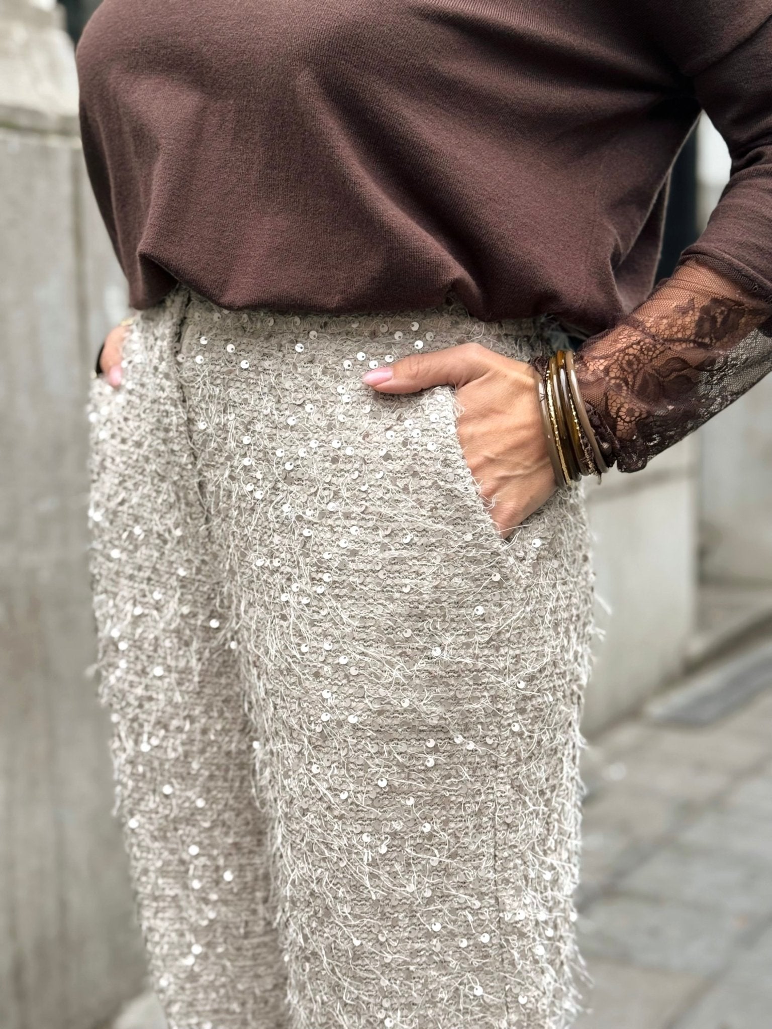 Le pantalon Ninon beige séduit par sa matière texturée et ses sequins délicats qui reflètent subtilement la lumière. Son élastique discret à la taille arrière apporte confort et maintien, tandis que la coupe droite assure une allure élégante et féminine. Une pièce idéale pour les fêtes ou une occasion spéciale.